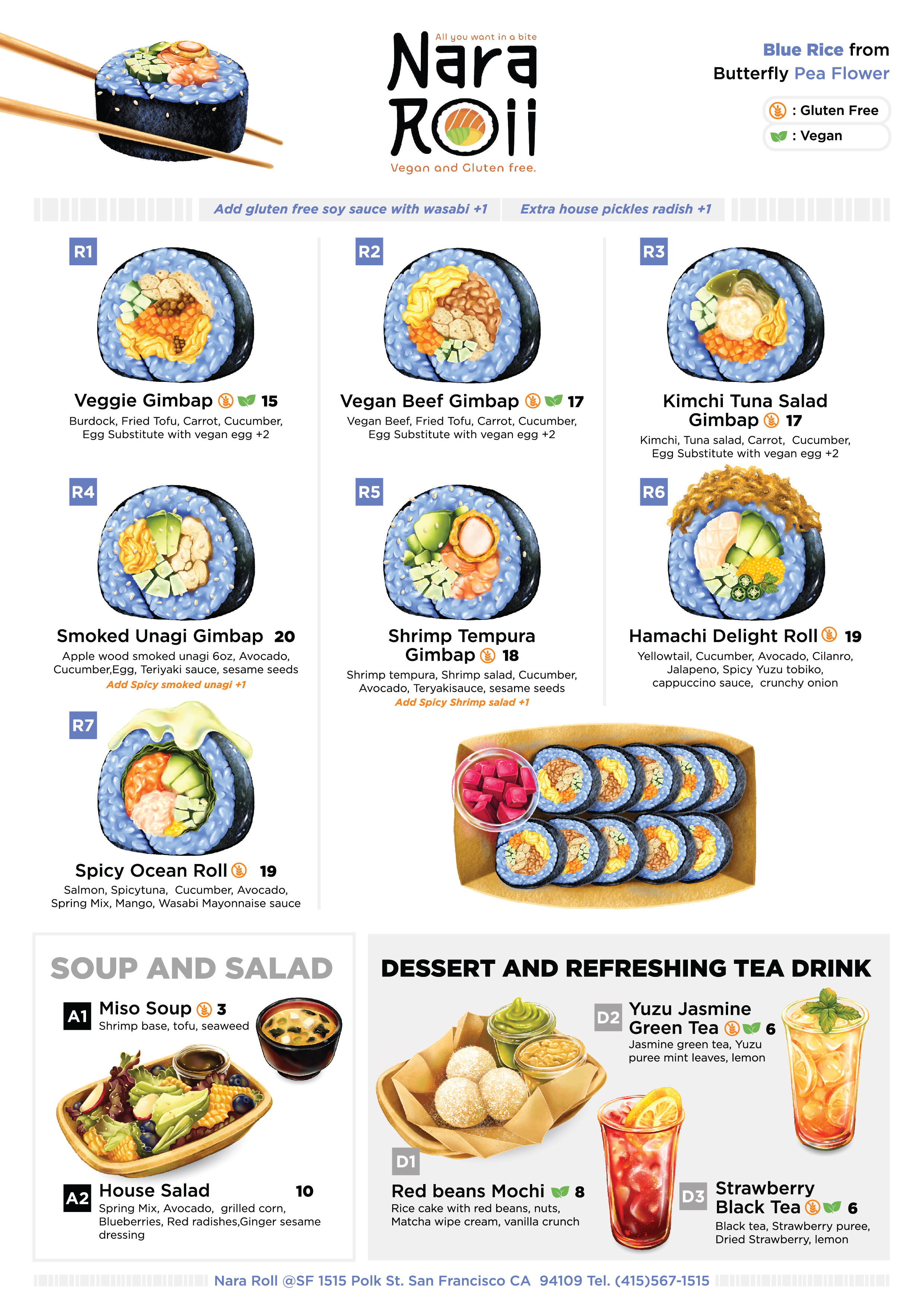 ' NARA SUSHI ' is a sushi restaurant along Polk St. This has now become my favorite sushi place in our neighborhood. They offer a good selection of sushis and entrees as well. I've found that their sushi is very fresh. My favorite sashimi is the sake (salmon) their chefs knowto select the best cuts and it's always fresh, not too fatty. Sometimes I'll order some tuna as well, with some steamed rice and miso soup my favorite Japanese comfort food. I'll tried the donburis (chicken and pork) as well and the portions are large and the sauce is done just right. I've tried their ramen noodles very well made and the broth was cooked and flavored right. Once or twice I've had a craving for friend ice cream and I come here the crust is nice and light while the ice cream remains cold. We tried a lot of their rolls and nigiri all quite good and it's a good time to try some exotic sushi. We had so many that night. The inari nigiri and sake nigiri were particularly good. The fried spicy rolls were delicious as well it's hard to order something that's not good here.
